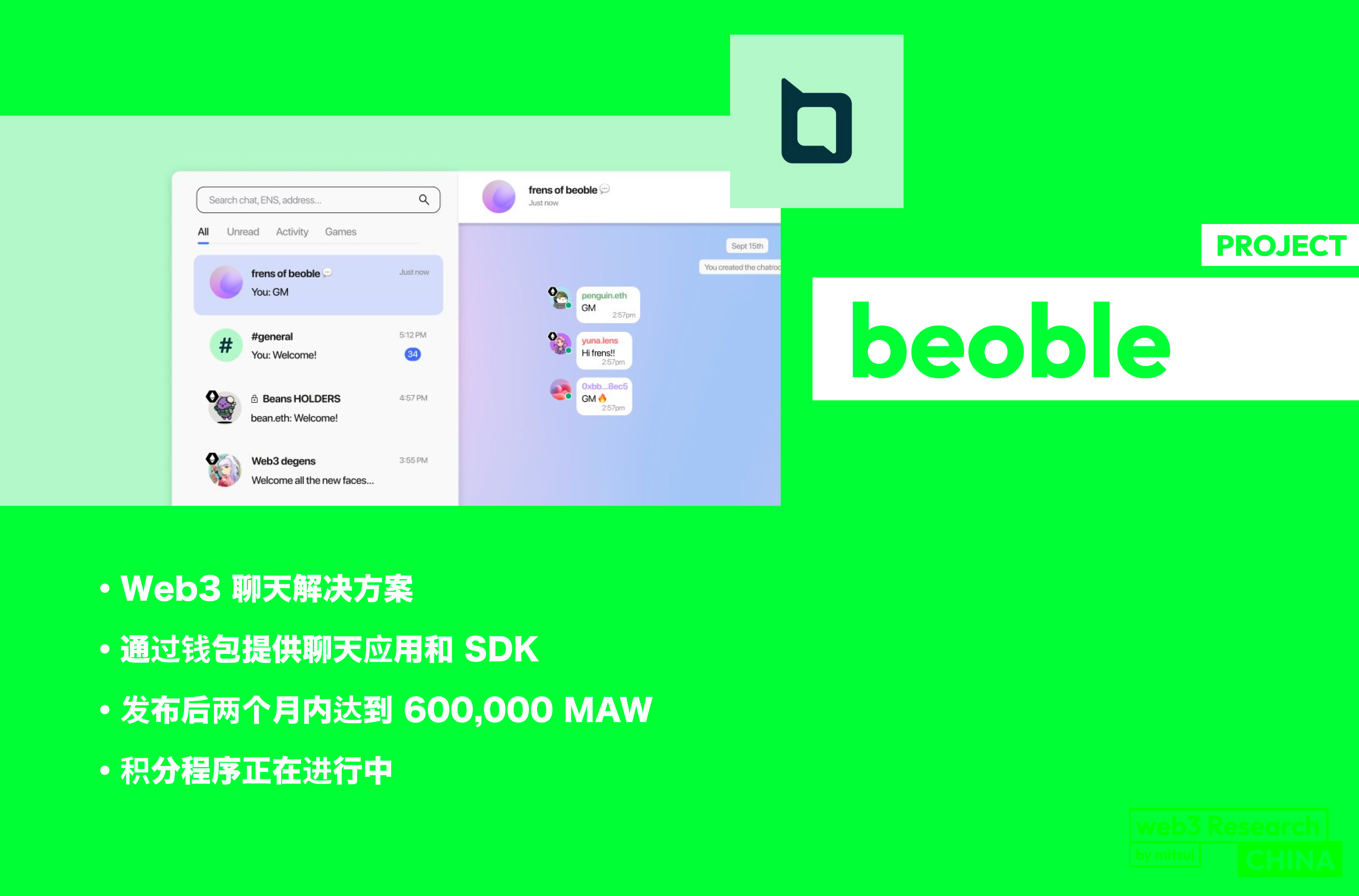 【Beoble】Web3 聊天解决方案 / 通过钱包提供聊天应用和 SDK / 发布后两个月内达到 600,000 MAW / 积分程序正在进行中 / @beoble_official