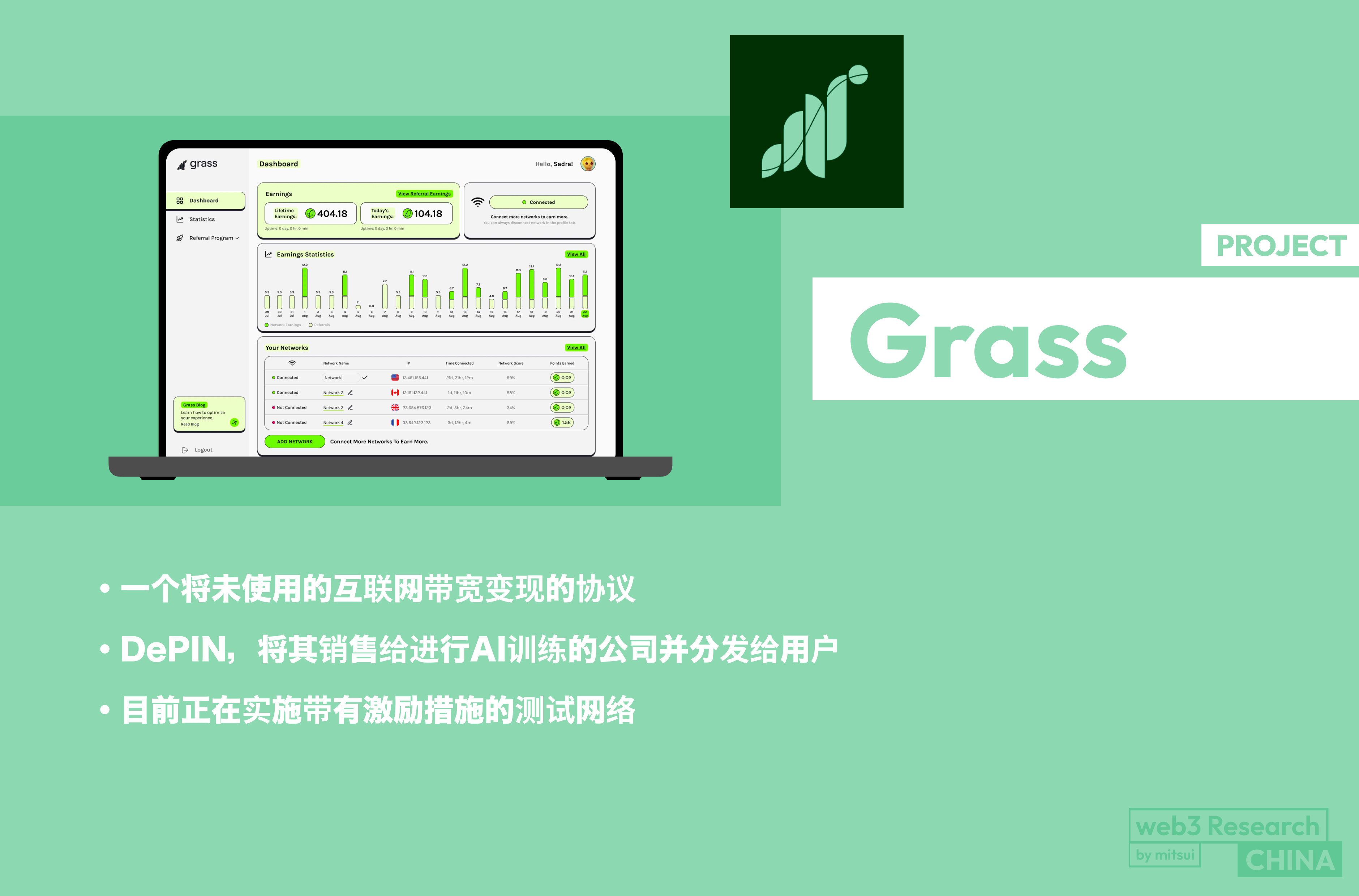 【Grass】 一个将未使用的互联网带宽变现的协议 / DePIN,将其销售给进行AI训练的公司并分发给用户 / 目前正在实施带有激励措施的测试网络